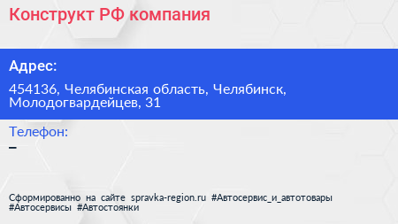 Конструкт РФ, компания по адресу 454136, Челябинская область, Челябинск, Молодогвардейцев, 31 в дальнейшем Организация, размещена в следующих категориях: