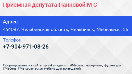 Приемная депутата Панковой М.С. по адресу 454087, Челябинская область, Челябинск, Мебельная, 56 в дальнейшем Организация, размещена в следующих категориях: