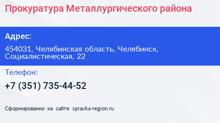 Прокуратура Металлургического района по адресу 454031, Челябинская область, Челябинск, Социалистическая, 22 в дальнейшем Организация, размещена в следующих категориях: