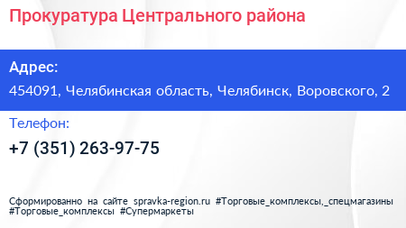 Прокуратура Центрального района по адресу 454091, Челябинская область, Челябинск, Воровского, 2 в дальнейшем Организация, размещена в следующих категориях: