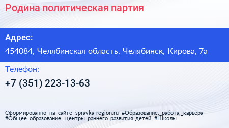 Родина, политическая партия по адресу 454084, Челябинская область, Челябинск, Кирова, 7а в дальнейшем Организация, размещена в следующих категориях: