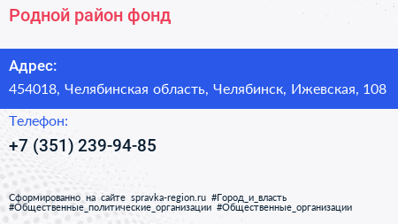 Родной район, фонд по адресу 454018, Челябинская область, Челябинск, Ижевская, 108 в дальнейшем Организация, размещена в следующих категориях: