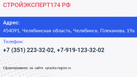 СТРОЙЭКСПЕРТ174.РФ по адресу 454091, Челябинская область, Челябинск, Плеханова, 19а в дальнейшем Организация, размещена в следующих категориях: