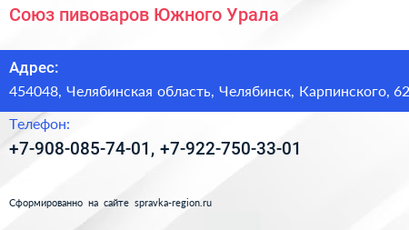 Союз пивоваров Южного Урала по адресу 454048, Челябинская область, Челябинск, Карпинского, 62 в дальнейшем Организация, размещена в следующих категориях: