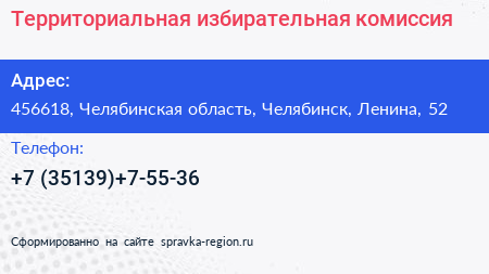 Территориальная избирательная комиссия по адресу 456618, Челябинская область, Челябинск, Ленина, 52 в дальнейшем Организация, размещена в следующих категориях: