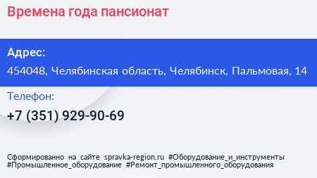 Времена года, пансионат по адресу 454048, Челябинская область, Челябинск, Пальмовая, 14 в дальнейшем Организация, размещена в следующих категориях: