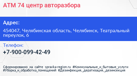 АТМ-74, центр авторазбора по адресу 454047, Челябинская область, Челябинск, Театральный переулок, 6 в дальнейшем Организация, размещена в следующих категориях: