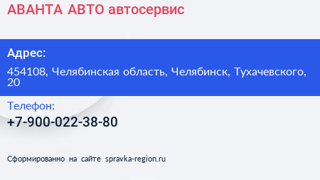 АВАНТА-АВТО, автосервис по адресу 454108, Челябинская область, Челябинск, Тухачевского, 20 в дальнейшем Организация, размещена в следующих категориях:
