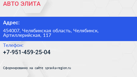 АВТО-ЭЛИТА по адресу 454007, Челябинская область, Челябинск, Артиллерийская, 117 в дальнейшем Организация, размещена в следующих категориях: