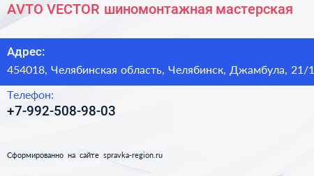 AVTO-VECTOR, шиномонтажная мастерская по адресу 454018, Челябинская область, Челябинск, Джамбула, 21/1 в дальнейшем Организация, размещена в следующих категориях: