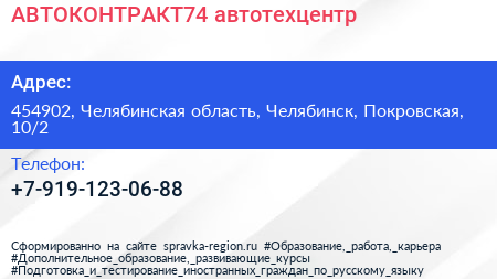 АВТОКОНТРАКТ74, автотехцентр по адресу 454902, Челябинская область, Челябинск, Покровская, 10/2 в дальнейшем Организация, размещена в следующих категориях: