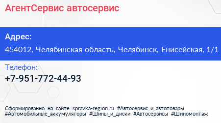 АгентСервис, автосервис по адресу 454012, Челябинская область, Челябинск, Енисейская, 1/1 в дальнейшем Организация, размещена в следующих категориях: