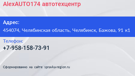 AlexAUTO174, автотехцентр по адресу 454074, Челябинская область, Челябинск, Бажова, 91 к1 в дальнейшем Организация, размещена в следующих категориях:
