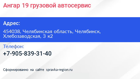 Ангар 19, грузовой автосервис по адресу 454038, Челябинская область, Челябинск, Хлебозаводская, 3 к2 в дальнейшем Организация, размещена в следующих категориях: