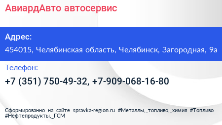 АвиардАвто, автосервис по адресу 454015, Челябинская область, Челябинск, Загородная, 9а в дальнейшем Организация, размещена в следующих категориях: