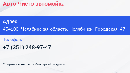 Авто-Чисто, автомойка по адресу 454100, Челябинская область, Челябинск, Городская, 47 в дальнейшем Организация, размещена в следующих категориях: