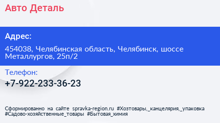 Авто Деталь по адресу 454038, Челябинская область, Челябинск, шоссе Металлургов, 25п/2 в дальнейшем Организация, размещена в следующих категориях: