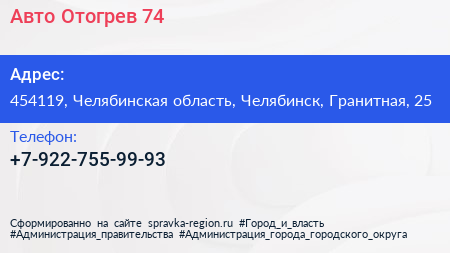 Авто Отогрев 74 по адресу 454119, Челябинская область, Челябинск, Гранитная, 25 в дальнейшем Организация, размещена в следующих категориях: