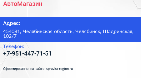 АвтоМагазин по адресу 454081, Челябинская область, Челябинск, Шадринская, 102/7 в дальнейшем Организация, размещена в следующих категориях: