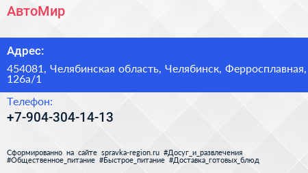АвтоМир по адресу 454081, Челябинская область, Челябинск, Ферросплавная, 126а/1 в дальнейшем Организация, размещена в следующих категориях: