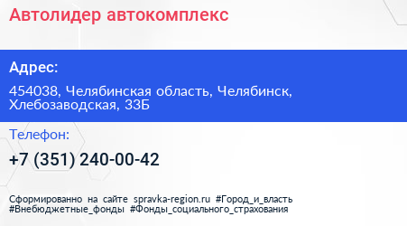 Автолидер, автокомплекс по адресу 454038, Челябинская область, Челябинск, Хлебозаводская, 33Б в дальнейшем Организация, размещена в следующих категориях: