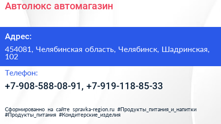 Автолюкс, автомагазин по адресу 454081, Челябинская область, Челябинск, Шадринская, 102 в дальнейшем Организация, размещена в следующих категориях: