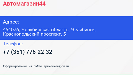 Автомагазин44 по адресу 454076, Челябинская область, Челябинск, Краснопольский проспект, 5 в дальнейшем Организация, размещена в следующих категориях: