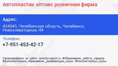 Автопластик, оптово-розничная фирма по адресу 454045, Челябинская область, Челябинск, Новоэлеваторная, 49 в дальнейшем Организация, размещена в следующих категориях: