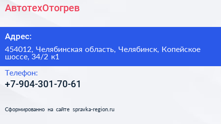 АвтотехОтогрев по адресу 454012, Челябинская область, Челябинск, Копейское шоссе, 34/2 к1 в дальнейшем Организация, размещена в следующих категориях: