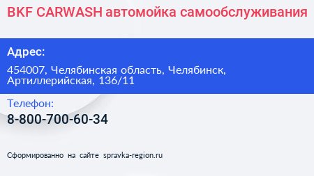BKF CARWASH, автомойка самообслуживания по адресу 454007, Челябинская область, Челябинск, Артиллерийская, 136/11 в дальнейшем Организация, размещена в следующих категориях: