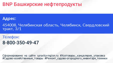 BNP Башкирские нефтепродукты по адресу 454008, Челябинская область, Челябинск, Свердловский тракт, 3/1 в дальнейшем Организация, размещена в следующих категориях: