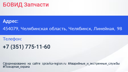 БОВИД Запчасти по адресу 454079, Челябинская область, Челябинск, Линейная, 98 в дальнейшем Организация, размещена в следующих категориях: