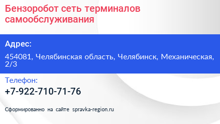 Бензоробот, сеть терминалов самообслуживания по адресу 454081, Челябинская область, Челябинск, Механическая, 2/3 в дальнейшем Организация, размещена в следующих категориях: