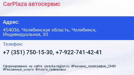 CarPlaza, автосервис по адресу 454036, Челябинская область, Челябинск, Индивидуальная, 10 в дальнейшем Организация, размещена в следующих категориях: