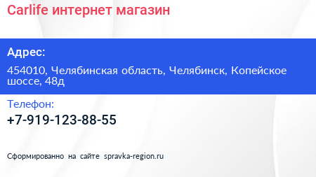 Carlife, интернет-магазин по адресу 454010, Челябинская область, Челябинск, Копейское шоссе, 48д в дальнейшем Организация, размещена в следующих категориях: