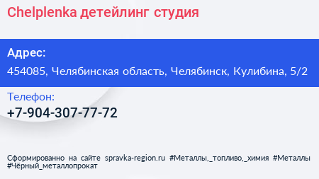 Chelplenka, детейлинг-студия по адресу 454085, Челябинская область, Челябинск, Кулибина, 5/2 в дальнейшем Организация, размещена в следующих категориях: