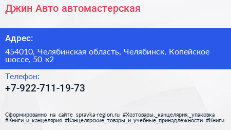 Джин Авто, автомастерская по адресу 454010, Челябинская область, Челябинск, Копейское шоссе, 50 к2 в дальнейшем Организация, размещена в следующих категориях:
