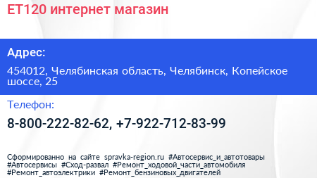 ЕТ120, интернет-магазин по адресу 454012, Челябинская область, Челябинск, Копейское шоссе, 25 в дальнейшем Организация, размещена в следующих категориях: