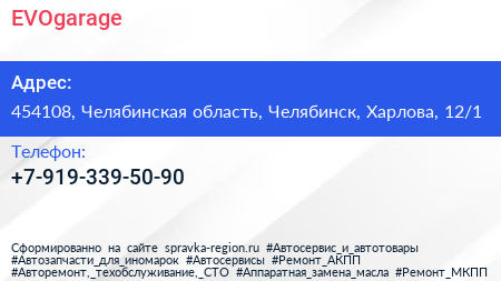 EVOgarage по адресу 454108, Челябинская область, Челябинск, Харлова, 12/1 в дальнейшем Организация, размещена в следующих категориях: