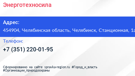 Энерготехносила по адресу 454904, Челябинская область, Челябинск, Станционная, 1а в дальнейшем Организация, размещена в следующих категориях: