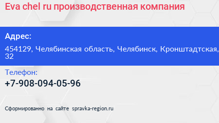 Eva-chel.ru, производственная компания по адресу 454129, Челябинская область, Челябинск, Кронштадтская, 32 в дальнейшем Организация, размещена в следующих категориях: