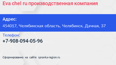 Eva-chel.ru, производственная компания по адресу 454017, Челябинская область, Челябинск, Дачная, 37 в дальнейшем Организация, размещена в следующих категориях: