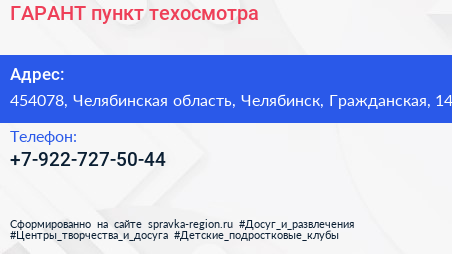 ГАРАНТ, пункт техосмотра по адресу 454078, Челябинская область, Челябинск, Гражданская, 14 в дальнейшем Организация, размещена в следующих категориях: