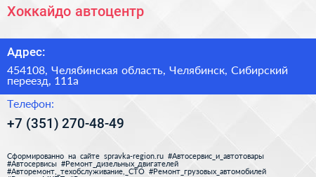 Хоккайдо, автоцентр по адресу 454108, Челябинская область, Челябинск, Сибирский переезд, 111а в дальнейшем Организация, размещена в следующих категориях: