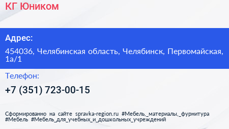 КГ Юником по адресу 454036, Челябинская область, Челябинск, Первомайская, 1а/1 в дальнейшем Организация, размещена в следующих категориях: