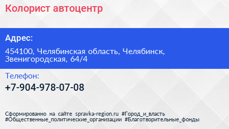 Колорист, автоцентр по адресу 454100, Челябинская область, Челябинск, Звенигородская, 64/4 в дальнейшем Организация, размещена в следующих категориях: