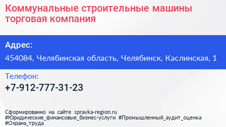 Коммунальные строительные машины, торговая компания по адресу 454084, Челябинская область, Челябинск, Каслинская, 1 в дальнейшем Организация, размещена в следующих категориях: