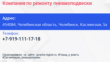 Компания по ремонту пневмоподвески по адресу 454084, Челябинская область, Челябинск, Каслинская, 5а в дальнейшем Организация, размещена в следующих категориях: