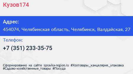 Кузов174 по адресу 454074, Челябинская область, Челябинск, Валдайская, 27 в дальнейшем Организация, размещена в следующих категориях: