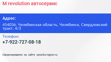 M-revolution, автосервис по адресу 454036, Челябинская область, Челябинск, Свердловский тракт, 4/3 в дальнейшем Организация, размещена в следующих категориях: